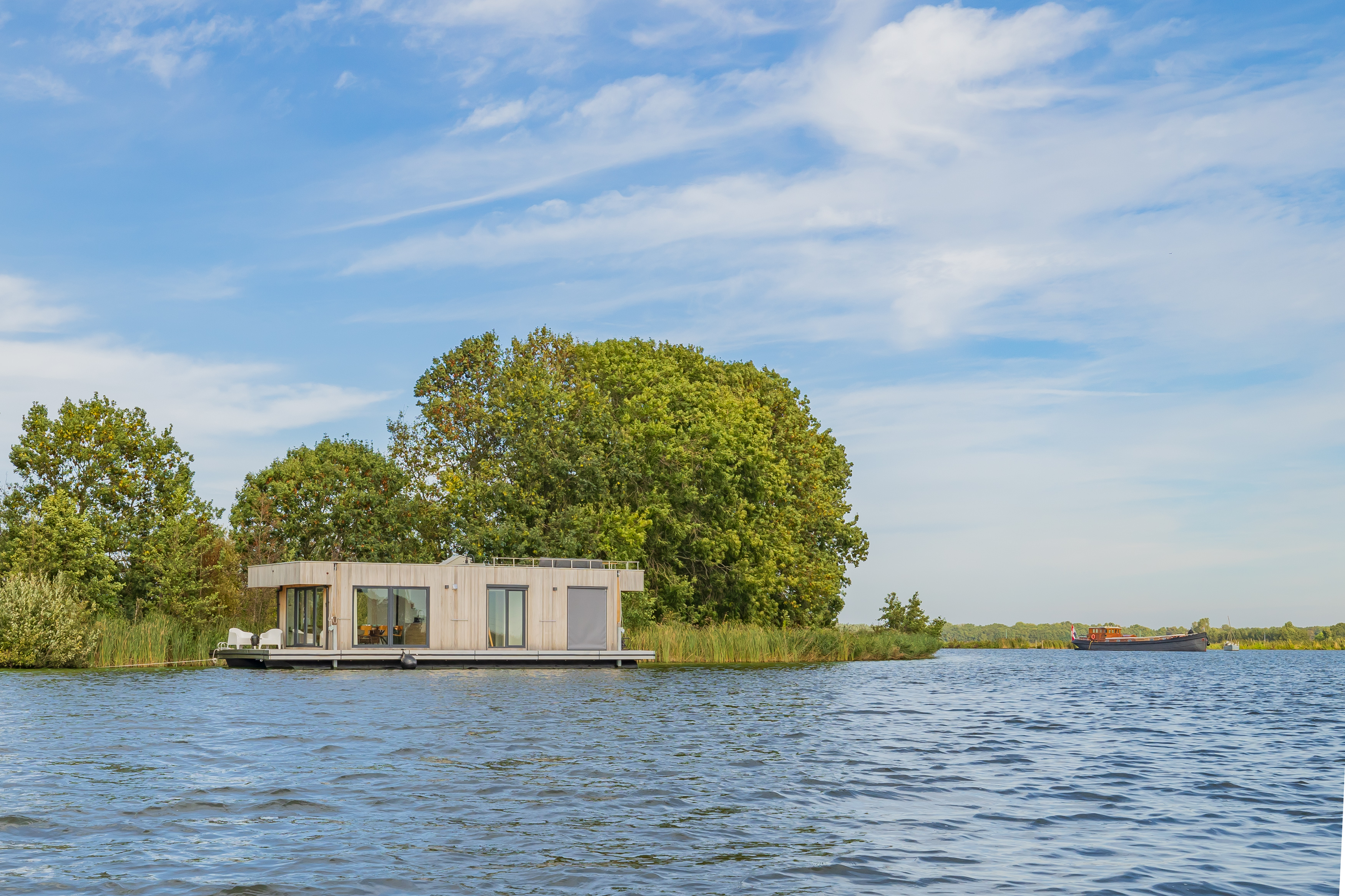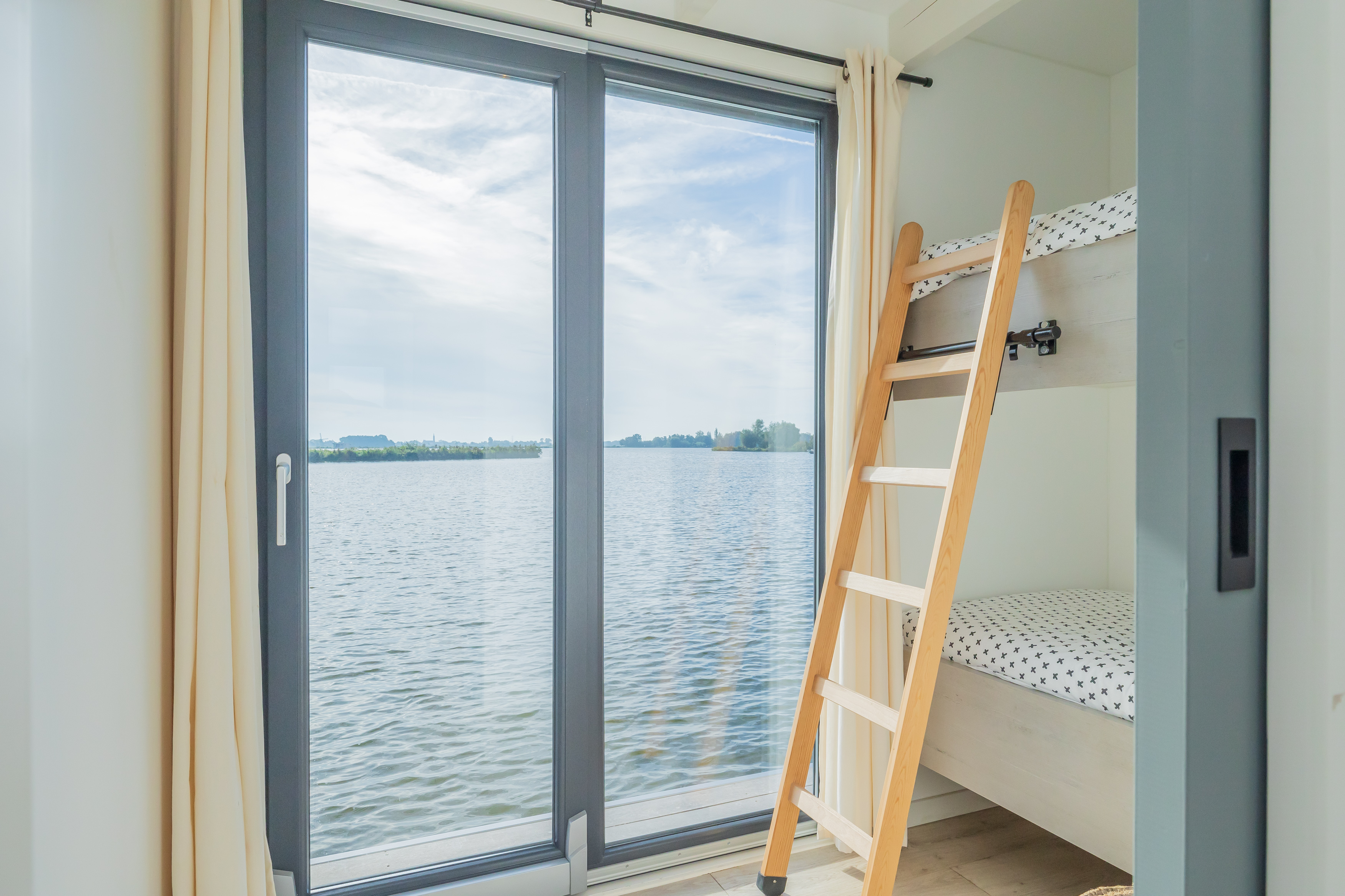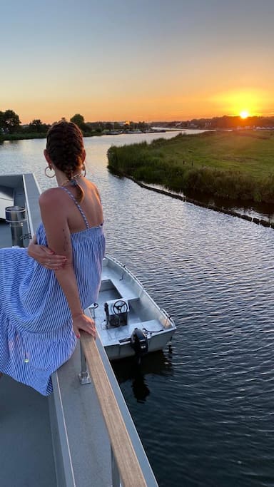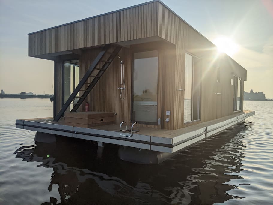 A Surla Houseboat is a sailing summer residence. Our water villas are fully equipped, 100% ecological and self-sufficient. Luxury, comfort and respect for nature come together here. From April/May on the houseboat is docked on open water. This houseboat (built in '22) is fully equipped. We'd love to welcome you as guests on our Surla houseboat to create beautiful memories with this unique experience. There is a spacious living room with a couch, dining table, tv, pellet stove and sliding doors to the front terrace with outdoor chairs. The open plan kitchen is fully equipped with an induction cooker, fridge, oven, dishwasher, kettle and Nespresso coffee machine. There's also a table-top freezer in the utility room. The bathroom is equipped with a shower, sink and a dry toilet. There are 3 bedrooms on the houseboat. Two bedrooms with hotel beds (1.80 x 2.00m), especially designed for Surla Houseboats. The third bedroom has a bunk bed (0.90 x 2.00m). Via outside stairs you can go to the spacious rooftop terrace (24m2) where there is a lounge set to enjoy beautifull sunrises and sunsets. Last but not least: on the back terrace is a warm outdoor shower, great after a swim. Before arrival: The check-in time is between 15.00 and 18.00pm. Earlier check-in is not possible due to cleaning of the houseboat. Meetingpoint: please park your car on the verge at Huigsloterdijk 348 in Buitenkaag. Do not drive directly to this home address, but park for free along the water in the verge. We have a host available: She will take you to the houseboat with the dinghy. Please inform the host your expected arrival time. This host is also available during your stay for questions or emergencies. You will receive her phone number with the check-in instructions one week before arrival. In the summer (wheather permitting), Surla puts the houseboat in a beautiful spot/location on the lake. The houseboat remains in place by means of spud poles. In bad weather conditions, a Surla employee will put the houseboat in a sheltered place (De Keverhaven). This can also happen during your rental period, because we don't want to take any risks. Surla Tender (Dinghy): During your stay we provide an dinghy. This aluminum tender is included during the rental of the houseboat. It is important that you start the tender with the trottle in Neutral. Do you want to lock the tender when you are not using it? Also at night? Sail slowly! Place the tender at the front or back of the houseboat. Gently moor so that there is no damage to the houseboat or tender. We will charge for damage immediately. The tender is fully fueled upon your arrival. The request is to fill it up again before checking out (Gasoline 98), so that the next guests also have a full tank. You can refuel at Bsl Watersport Huigsloterdijk 400 in Buitenkaag or at Van Schie Watersports: Zijldijk 11 in Warmond. You can also put the amount on the table in cash: 40 euros for an empty tank and 20 euros for half a tank. If the tender has not been refueled and no money has been left behind on departure, we will charge the costs afterwards. NOTE: * Surla rents out several houseboats at different locations. It is possible that the location, the floorplan of the houseboat and the interior in the photos differs from the actual houseboat. All our houseboats were built in 2022-2023. * We have a camera that faces outward, and it hangs outside on the front deck. This turns off as soon as the guests come on board. So it is purely for safety if there are no guests. There are no cameras inside. *Swimming certificates are highly recommended. We will not recommend the houseboat for people with walking difficulties. *We advise you to do necessary shopping before boarding. Standard on board is a few Nespresso coffee capsules, milk, sugar, tea, oil, pepper, salt and a few toilet rolls. We have towels and the beds are made for your arrival. *There is no public transport nearby. Everything has to be done with the dinghy, such as visiting a restaurant or a supermarket. *We don't let our guests sail with the Surla houseboat themselves, but a dinghy is included in the rent. Sail at walking pace with the dinghy, we are guests on the water. Any fines are for your own account. *No parties allowed. Our Surla Houseboats are built sustainably and are 100% self-sufficient. We have ingenious systems on board that allow you to recreate without going on shore power, and we also have filter systems that mean we don't have to have water tanks on board. We are guests on the water and have done everything possible to implement 100% off-grid and ecologically responsible solutions. We would love to welcome you as guests to create beautiful memories with this unique experience.