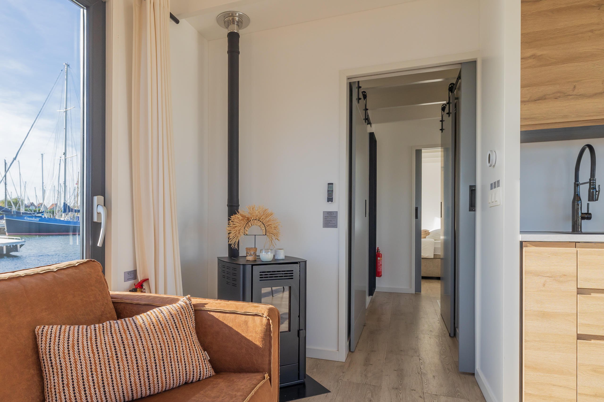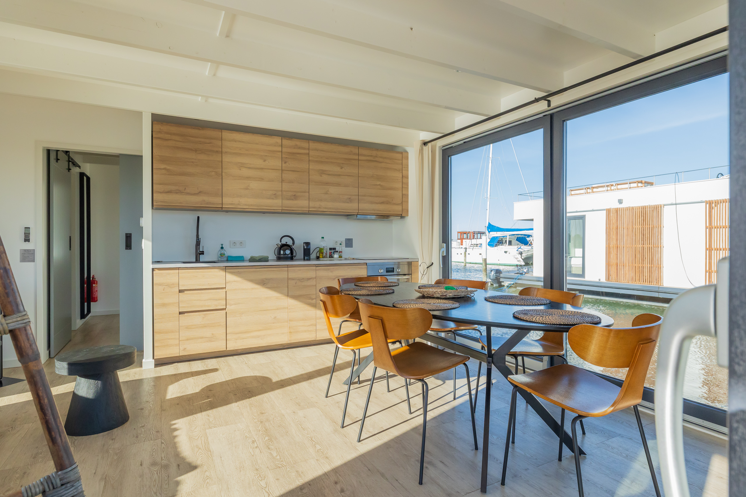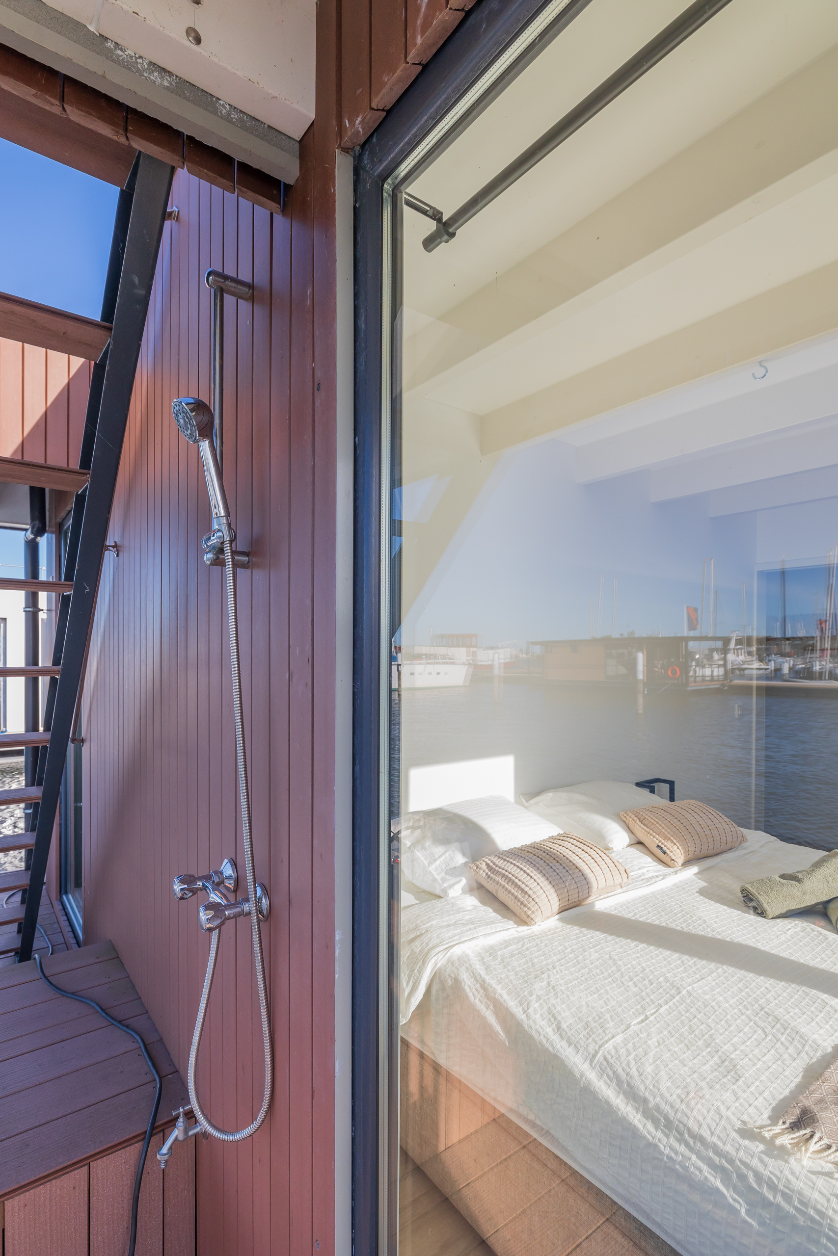A Surla Houseboat is a sailing summer residence. Our water villas are fully equipped, 100% ecological and self-sufficient. Luxury, comfort and respect for nature come together here. This houseboat (built in '22) is fully equipped. The Surla Houseboat is 15 meters long and 6 meters wide. A total area of 84m2 excluding the roof terrace. The living room and kitchen are 25m2, and equipped with 3 large sliding doors, so you always have a phenomenal view. There is a spacious living room with a couch, dining table, tv and sliding doors to the front terrace with outdoor chairs. The open plan kitchen is fully equipped with an induction cooker, fridge, oven, dishwasher, kettle and Nespresso coffee machine. There's also a table-top freezer in the utility room. The bathroom is equipped with a shower, sink and a (dry) toilet. There are 3 bedrooms on the houseboat. Two bedrooms with hotel beds (1.80 x 2.00m), especially designed for Surla Houseboats. The third bedroom has a bunk bed (0.90 x 2.00m). Via outside stairs you can go to the spacious rooftop terrace where there is a lounge set to enjoy beautifull sunrises and sunsets. Last but not least: on the back terrace is a warm outdoor shower, great after a swim. Surla has check-in hosts available, here name is Natasja. She will welcome you and guide you to the houseboat. It is nice for our hosts that you indicate early what your expected arrival time is. You will receive the host's telephone number in the instructions. You will receive this via email more than a week before arrival. Location houseboat: In the summer (wheather permitting), Surla puts the houseboat in a beautiful spot/location on the lake. The houseboat remains in place by means of spud poles. In bad weather conditions, a Surla employee will put the houseboat in a sheltered place in the marina of Monnickendam. This can also happen during your rental period, because we don't want to take any risks. You can park your car in the marina of Monnickendam (free parking). After passing the entrance gate. Drive straight, after the white building, the 2nd road to the left. At the end of the road you can park your car. Surla Tender (Dinghy): During your stay we provide an dinghy. This aluminum tender is included during the rental of the houseboat. It is important that you start the tender with the trottle in Neutral. Do you want to lock the tender when you are not using it? Also at night? Sail slowly! Place the tender at the front or back of the houseboat. Gently moor so that there is no damage to the houseboat or tender. We will charge for damage immediately. The tender is fully fueled upon your arrival. The request is to fill it up again before checking out (Gasoline 98), so that the next guests also have a full tank. You can buy gasoline at the Texaco in the village or you can buy a jerry can from our host Uwe. You can also put the amount on the table in cash: 40 euros for an empty tank and 20 euros for half a tank. If the tender has not been refueled and no money has been left behind on departure, we will charge the costs afterwards. Note: * We don't let our guests sail with the Surla houseboat themselves, but a dinghy is included in the rent. Sail at walking pace with the dinghy, we are guests on the water. Any fines are for your own account. Note: * We don't let our guests sail with the Surla houseboat themselves, but a dinghy is included in the rent. Sail at walking pace with the dinghy, we are guests on the water. Any fines are for your own account. you will have to pay extra for the petrol. *No parties allowed. * We have a camera that faces outward, and it hangs outside on the front deck. This turns off as soon as the guests come on board. So it is purely for safety if there are no guests. There are no cameras inside. * Surla rents out several houseboats at different locations. It is possible that the location, the floorplan of the houseboat and the interior in the photos differs from the actual houseboat. All our houseboats were built in 2022-2023. * Swimming certificates are highly recommended. We will not recommend the houseboat for people with walking difficulties. * We advise you to do necessary shopping before boarding. Standard on board is a few Nespresso coffee capsules, milk, sugar, tea, oil, pepper, salt and a few toilet rolls. We have towels and the beds are made for your arrival. Our Surla Houseboats are built sustainably and are 100% self-sufficient.We have ingenious systems on board that allow you to recreate without going on shore power, and we also have filter systems that mean we don't have to have water tanks on board.We are guests on the water and have done everything possible to implement 100% off-grid and ecologically responsible solutions. We would love to welcome you as guests to create beautiful memories with this unique experience.