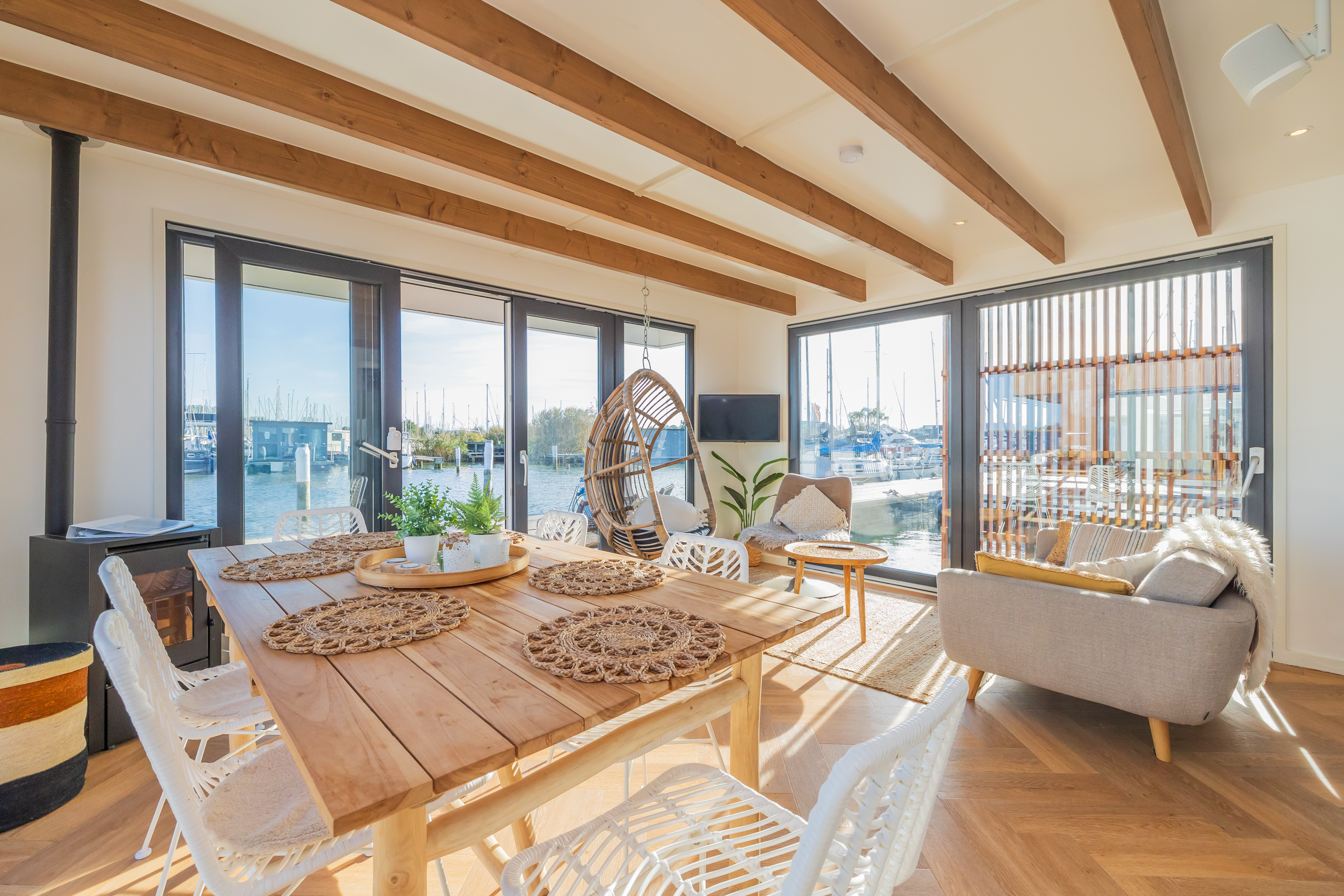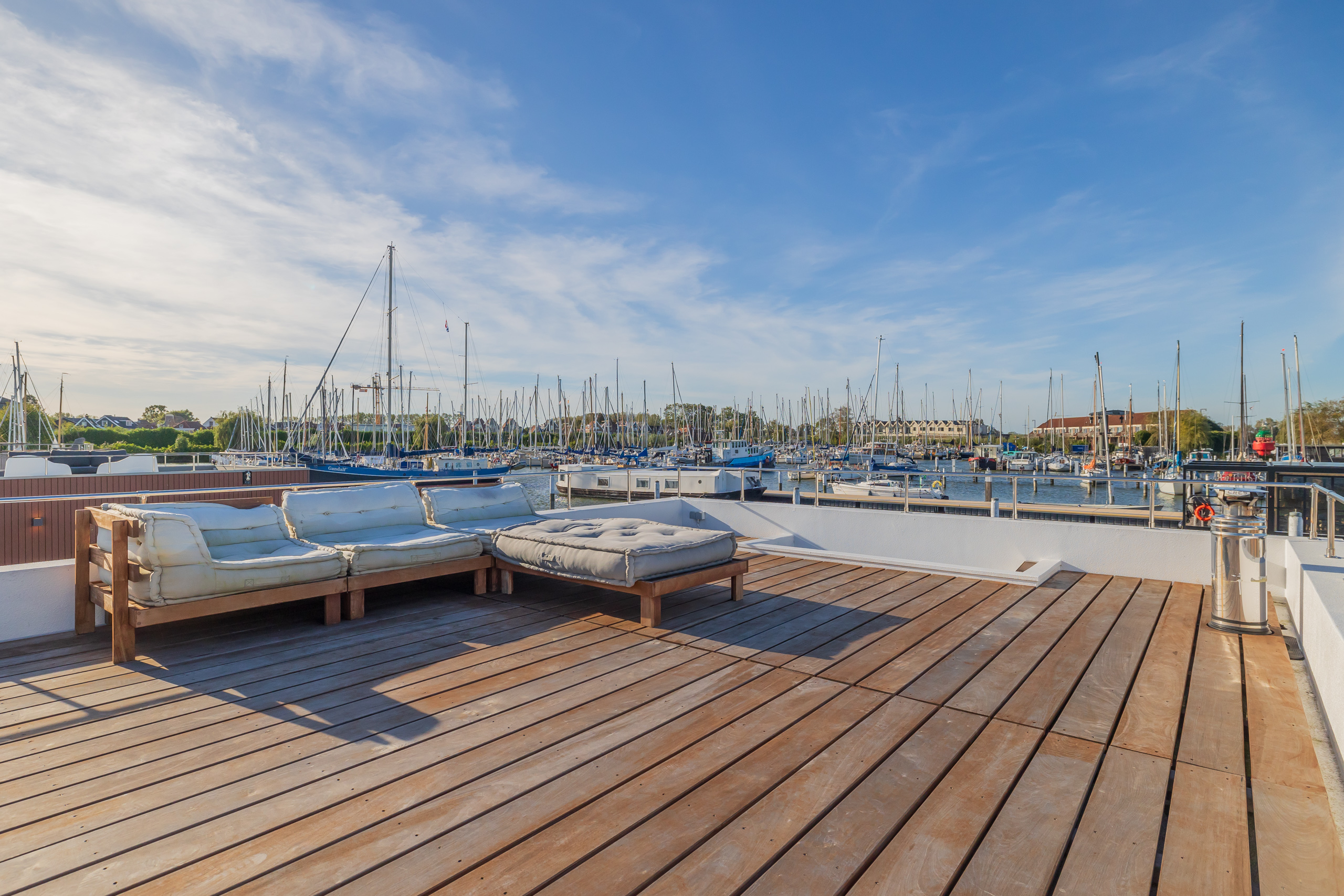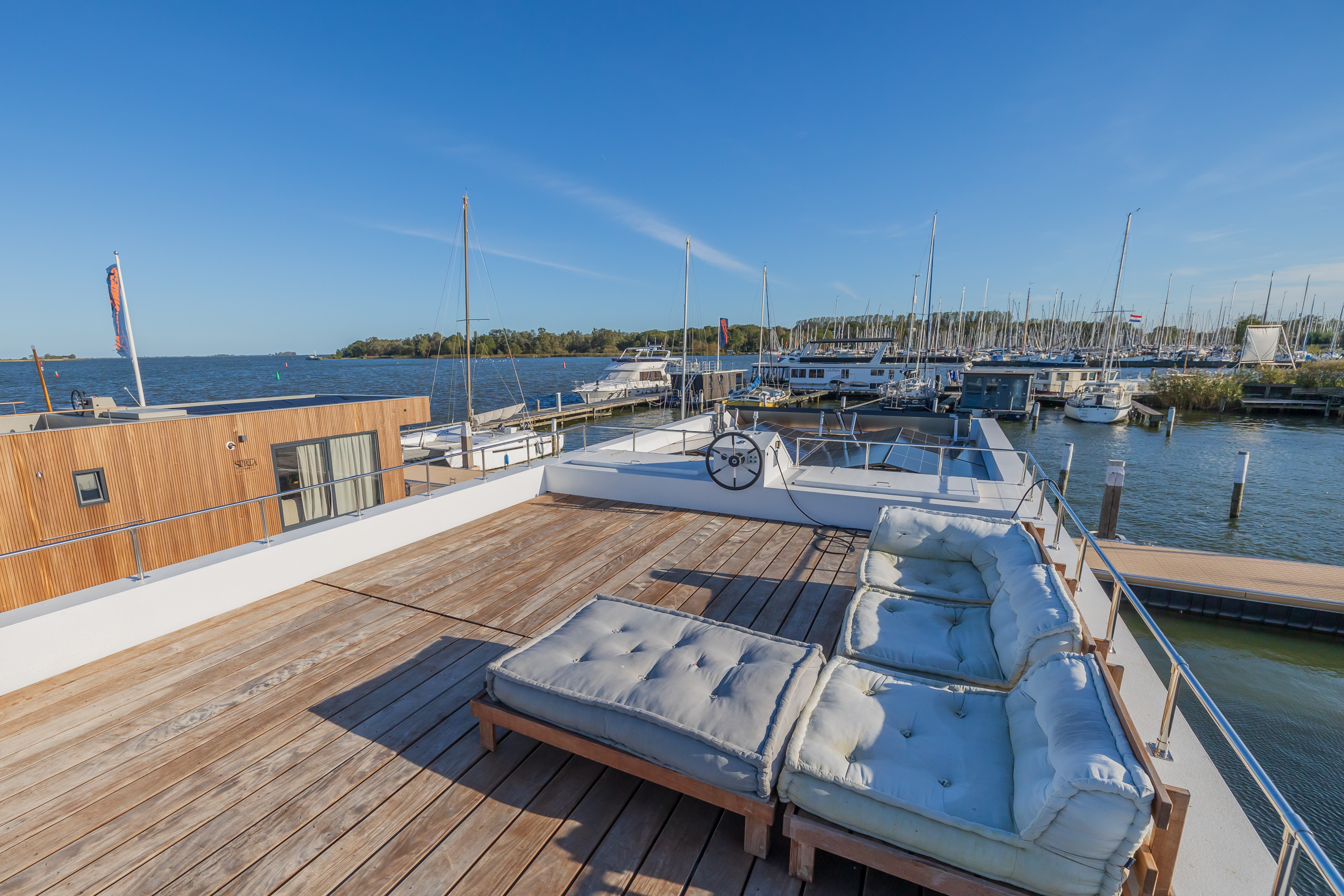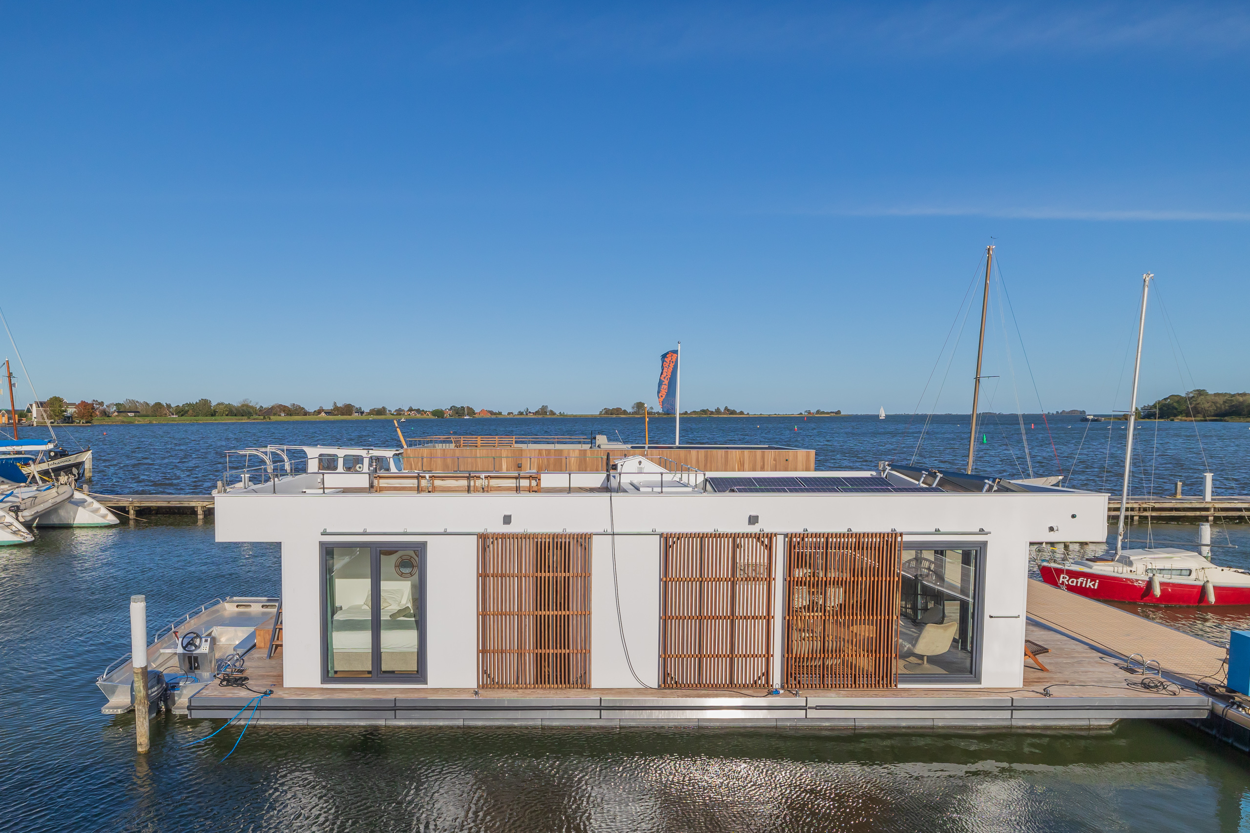 A Surla Houseboat is a sailing summer residence. Our water villas are fully equipped, This houseboat, our LUXURY version, is a special one from the Surla fleet. Built in 2023 with a SAUNA. Decorated in Ibiza style and fully equipped. There is a spacious living room with a couch, dining table, tv, Sonos sound system and sliding doors to the front terrace with outdoor chairs. The open plan kitchen is fully equipped with an induction cooker, fridge, oven, dishwasher, kettle and Nespresso coffee machine. There's also a table-top freezer in the utility room. The bathroom is equipped with a shower, sink and a (dry) toilet. There are 3 bedrooms on the houseboat. Two bedrooms with hotel beds (1.80 x 2.00m and 1.60 x 2.00m), especially designed for Surla Houseboats. The third bedroom has a cosy (1.40 x 2.00m) bed. Via outside stairs you can go to the spacious rooftop terrace where there is a lounge set to enjoy beautiful sunrises and sunsets. On the back terrace is a warm outdoor shower, great after a swim. And last but not least, the sauna! Host: Surla has check-in host, here name is Natasja. She will welcome you and guide you to the houseboat. It is nice for our hosts that you indicate early what your expected arrival time is. You will receive the host's telephone number in the instructions. You will receive this via email more than a week before arrival. Location: You can park your car in the marina of Monnickendam (free parking). After passing the entrance gate. Drive straight, after the white building, the 2nd road to the left. At the end of the road you can park your car. Location houseboat: In the summer (wheather permitting), Surla puts the houseboat in a beautiful spot/location on the lake. The houseboat remains in place by means of spud poles. In bad weather conditions, a Surla employee will put the houseboat in a sheltered place in the marina of Monnickendam. This can also happen during your rental period, because we don't want to take any risks. Surla Tender (Dinghy): During your stay we provide an dinghy. This aluminum tender is included during the rental of the houseboat. It is important that you start the tender with the trottle in Neutral. Do you want to lock the tender when you are not using it? Also at night? Sail slowly! Place the tender at the front or back of the houseboat. Gently moor so that there is no damage to the houseboat or tender. We will charge for damage immediately. The tender is fully fueled upon your arrival. The request is to put the amount on the table in cash: 40 euros for an empty tank and 20 euros for half a tank. If the tender has not been refueled and no money has been left behind on departure, we will charge the costs afterwards. Note: * We don't let our guests sail with the Surla houseboat themselves, but a dinghy is included in the rent. Sail at walking pace with the dinghy, we are guests on the water. Any fines are for your own account. Note: * We don't let our guests sail with the Surla houseboat themselves, but a dinghy is included in the rent. Sail at walking pace with the dinghy, we are guests on the water. Any fines are for your own account. * No parties or filming allowed. * We have a camera that faces outward, and it hangs outside on the front deck. This turns off as soon as the guests come on board. So it is purely for safety if there are no guests. There are no cameras inside. * Surla rents out several houseboats at different locations. It is possible that the location, the floorplan of the houseboat and the interior in the photos differs from the actual houseboat. All our houseboats were built in 2022-2023. * Swimming certificates are highly recommended. We will not recommend the houseboat for people with walking difficulties. * We advise you to do necessary shopping before boarding. Standard on board is a few Nespresso coffee capsules, milk, sugar, tea, oil, pepper, salt and a few toilet rolls. We have towels and the beds are made for your arrival. Sauna: This houseboat has a wood sauna on board, which is located at the back of the houseboat. Surla provides wood, firelighters and kindling wood. It is the tenant's responsibility to use the sauna in a proper manner. Please understand that you work with open fire, do not use any other flammable substances than provided by Surla (firelighters, kindling and firewood). The use of the sauna is entirely at your own risk. Our Surla Houseboats are built sustainably and are 100% self-sufficient.We have ingenious systems on board that allow you to recreate without going on shore power, and we also have filter systems that mean we don't have to have water tanks on board.We are guests on the water and have done everything possible to implement 100% off-grid and ecologically responsible solutions. We would love to welcome you as guests to create beautiful memories with this unique experience.