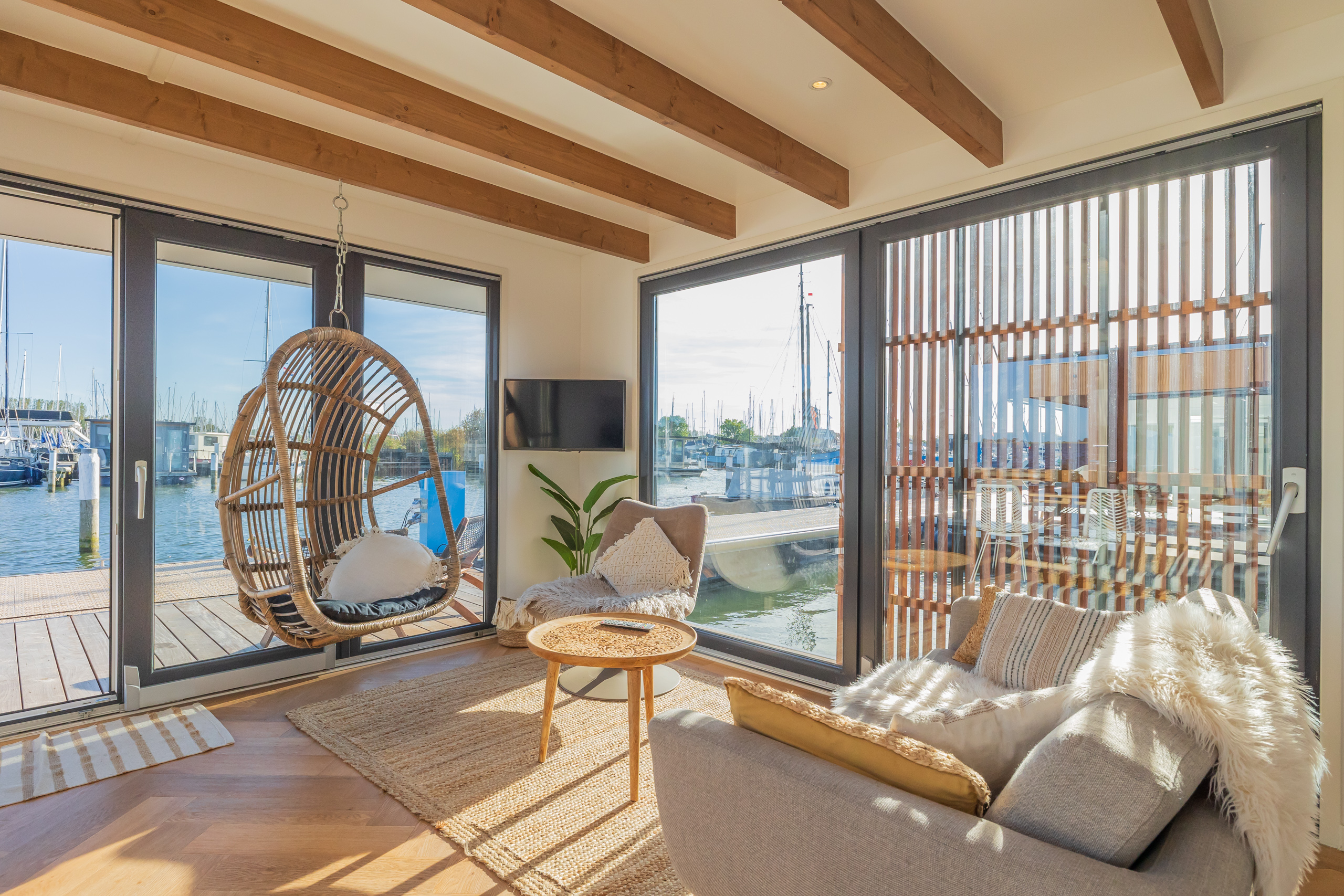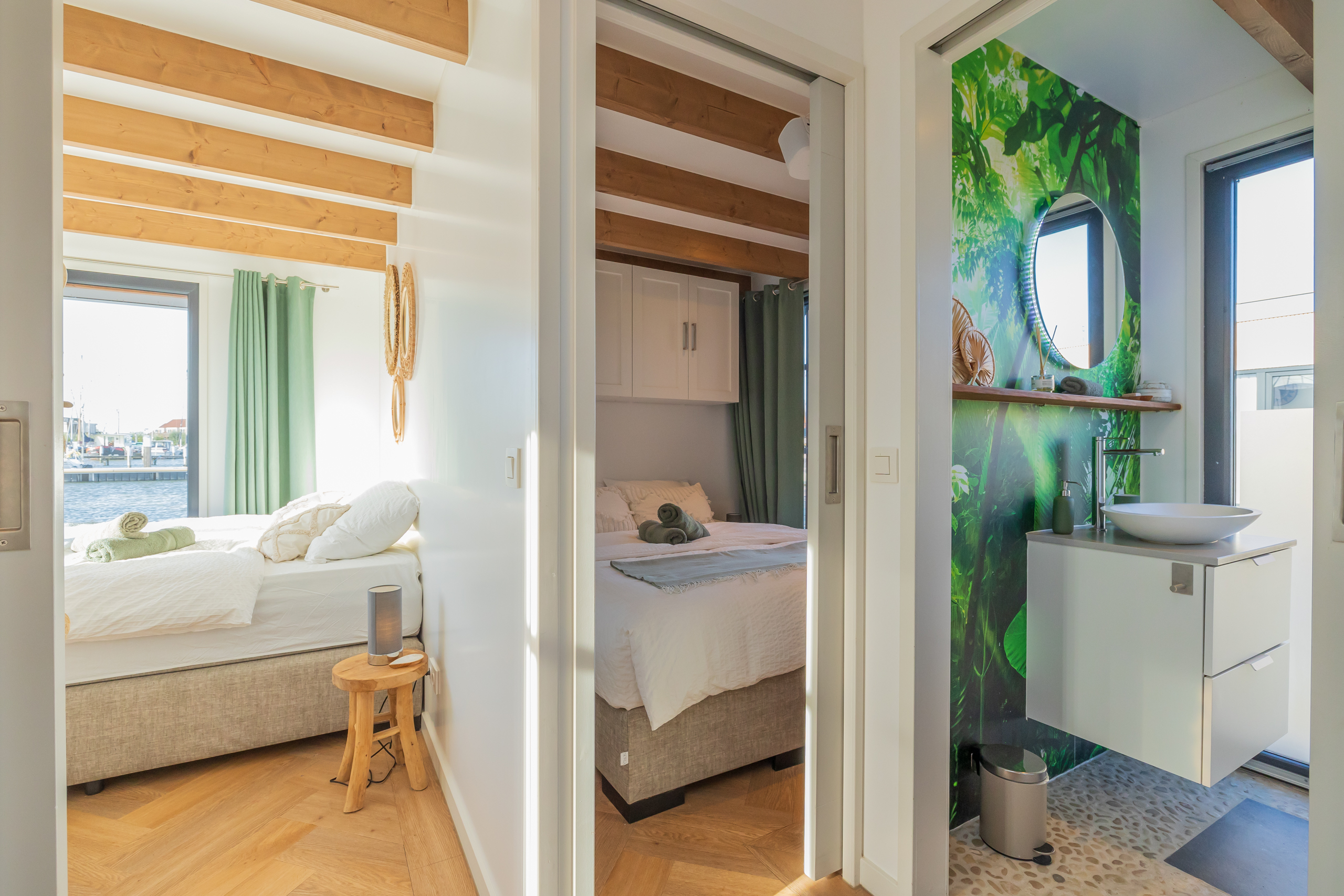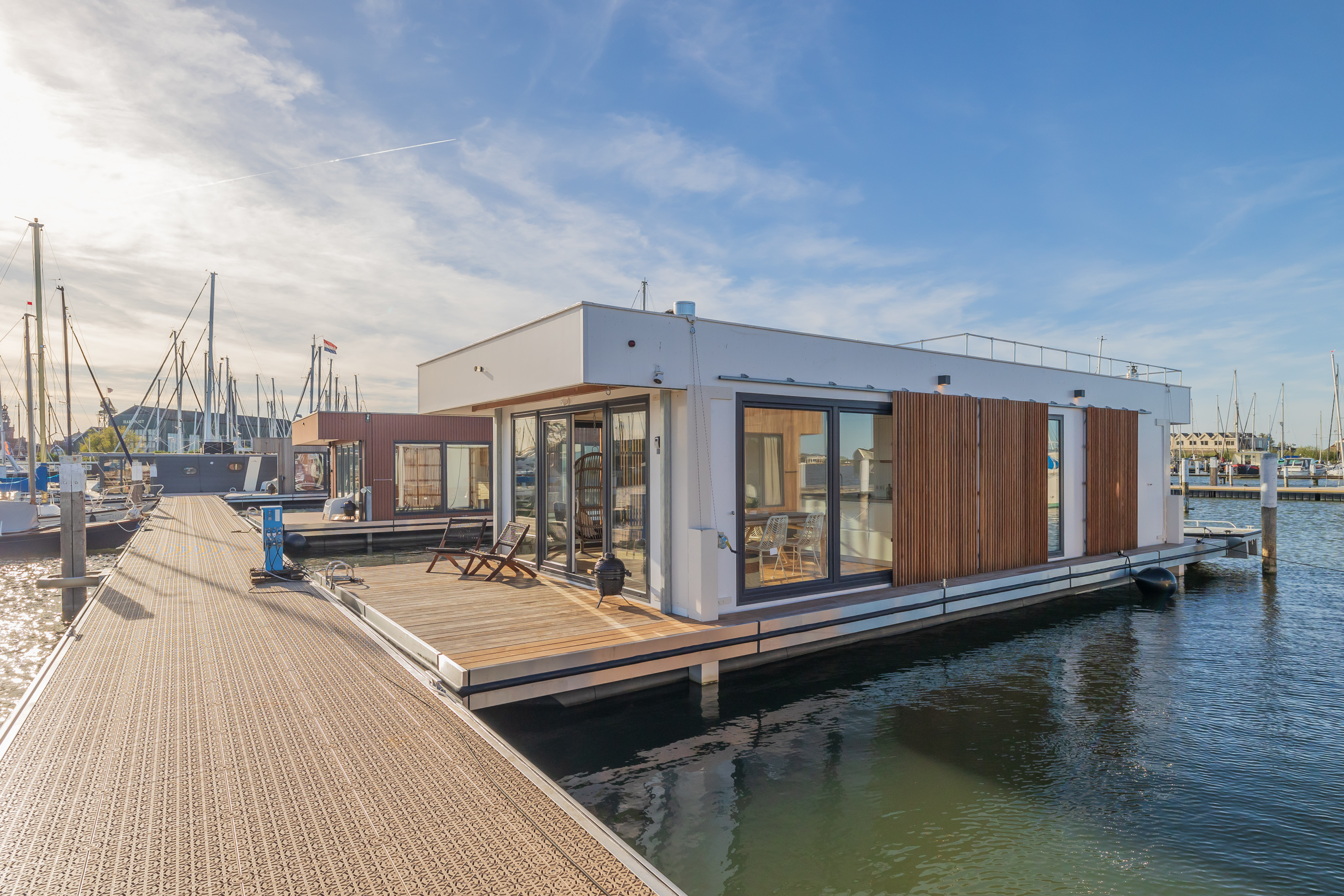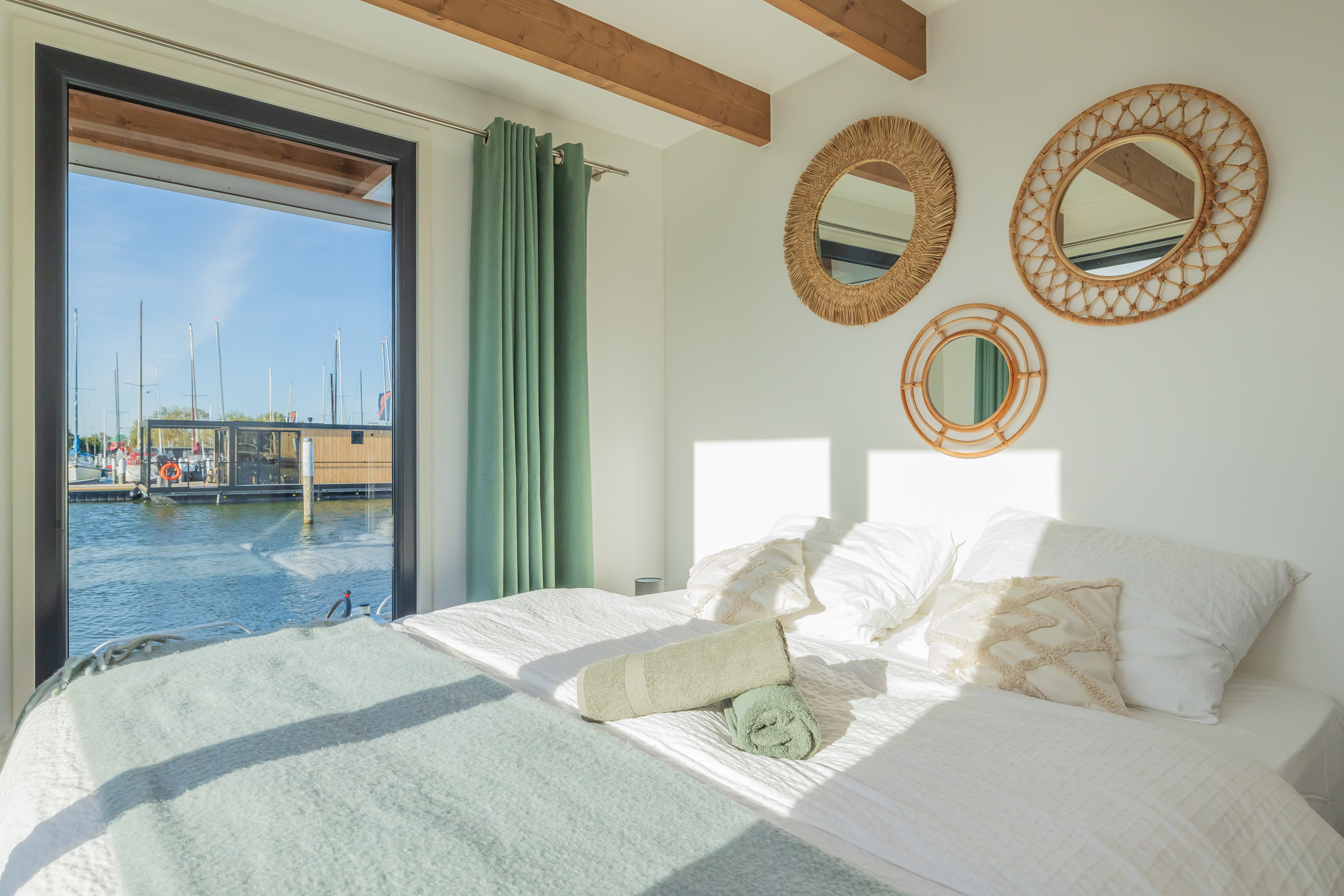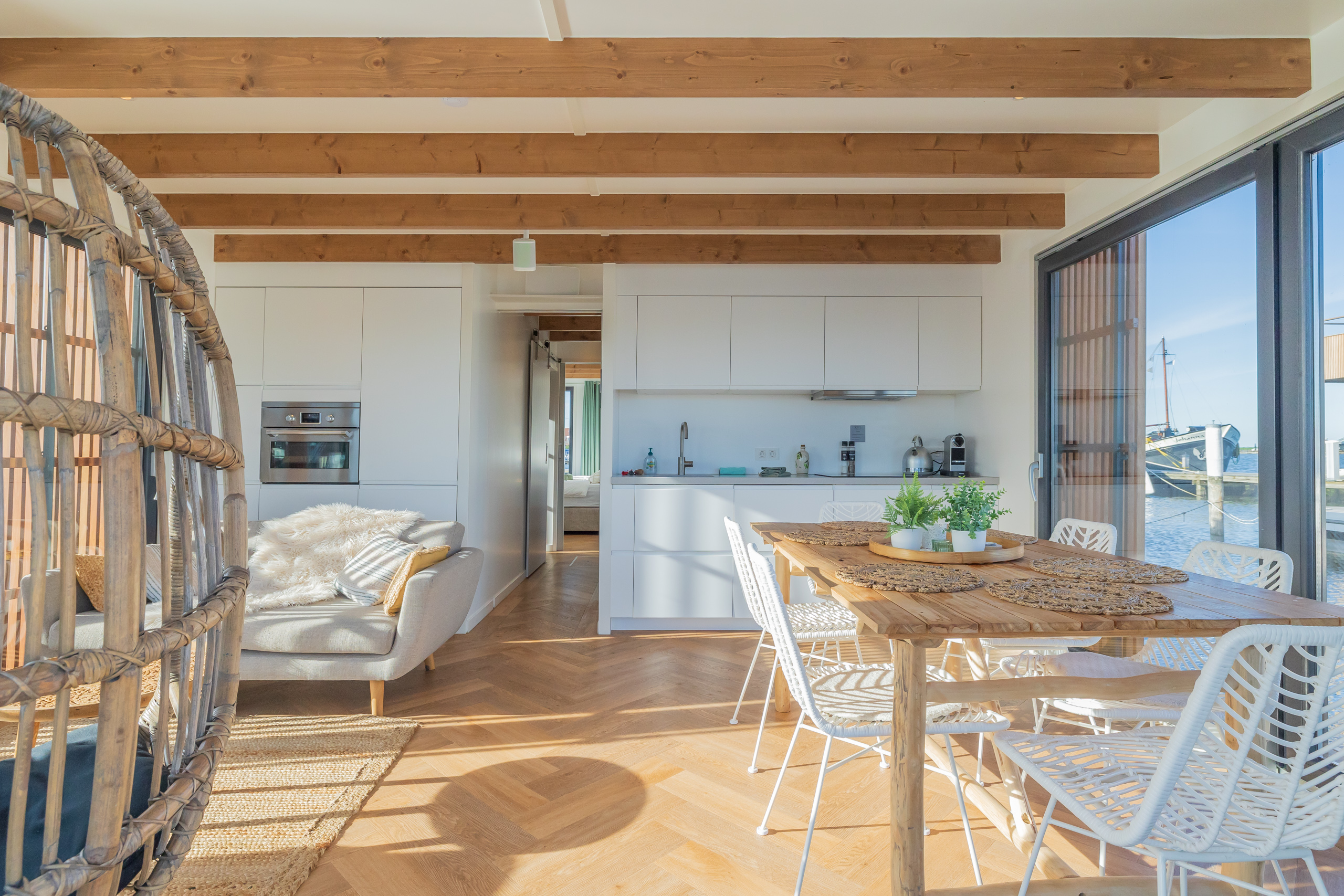 A Surla Houseboat is a sailing summer residence. Our water villas are fully equipped, This houseboat, our LUXURY version, is a special one from the Surla fleet. Built in 2023 with a SAUNA. Decorated in Ibiza style and fully equipped. There is a spacious living room with a couch, dining table, tv, Sonos sound system and sliding doors to the front terrace with outdoor chairs. The open plan kitchen is fully equipped with an induction cooker, fridge, oven, dishwasher, kettle and Nespresso coffee machine. There's also a table-top freezer in the utility room. The bathroom is equipped with a shower, sink and a (dry) toilet. There are 3 bedrooms on the houseboat. Two bedrooms with hotel beds (1.80 x 2.00m and 1.60 x 2.00m), especially designed for Surla Houseboats. The third bedroom has a cosy (1.40 x 2.00m) bed. Via outside stairs you can go to the spacious rooftop terrace where there is a lounge set to enjoy beautiful sunrises and sunsets. On the back terrace is a warm outdoor shower, great after a swim. And last but not least, the sauna! Host: Surla has check-in host, here name is Natasja. She will welcome you and guide you to the houseboat. It is nice for our hosts that you indicate early what your expected arrival time is. You will receive the host's telephone number in the instructions. You will receive this via email more than a week before arrival. Location: You can park your car in the marina of Monnickendam (free parking). After passing the entrance gate. Drive straight, after the white building, the 2nd road to the left. At the end of the road you can park your car. Location houseboat: In the summer (wheather permitting), Surla puts the houseboat in a beautiful spot/location on the lake. The houseboat remains in place by means of spud poles. In bad weather conditions, a Surla employee will put the houseboat in a sheltered place in the marina of Monnickendam. This can also happen during your rental period, because we don't want to take any risks. Surla Tender (Dinghy): During your stay we provide an dinghy. This aluminum tender is included during the rental of the houseboat. It is important that you start the tender with the trottle in Neutral. Do you want to lock the tender when you are not using it? Also at night? Sail slowly! Place the tender at the front or back of the houseboat. Gently moor so that there is no damage to the houseboat or tender. We will charge for damage immediately. The tender is fully fueled upon your arrival. The request is to put the amount on the table in cash: 40 euros for an empty tank and 20 euros for half a tank. If the tender has not been refueled and no money has been left behind on departure, we will charge the costs afterwards. Note: * We don't let our guests sail with the Surla houseboat themselves, but a dinghy is included in the rent. Sail at walking pace with the dinghy, we are guests on the water. Any fines are for your own account. Note: * We don't let our guests sail with the Surla houseboat themselves, but a dinghy is included in the rent. Sail at walking pace with the dinghy, we are guests on the water. Any fines are for your own account. * No parties or filming allowed. * We have a camera that faces outward, and it hangs outside on the front deck. This turns off as soon as the guests come on board. So it is purely for safety if there are no guests. There are no cameras inside. * Surla rents out several houseboats at different locations. It is possible that the location, the floorplan of the houseboat and the interior in the photos differs from the actual houseboat. All our houseboats were built in 2022-2023. * Swimming certificates are highly recommended. We will not recommend the houseboat for people with walking difficulties. * We advise you to do necessary shopping before boarding. Standard on board is a few Nespresso coffee capsules, milk, sugar, tea, oil, pepper, salt and a few toilet rolls. We have towels and the beds are made for your arrival. Sauna: This houseboat has a wood sauna on board, which is located at the back of the houseboat. Surla provides wood, firelighters and kindling wood. It is the tenant's responsibility to use the sauna in a proper manner. Please understand that you work with open fire, do not use any other flammable substances than provided by Surla (firelighters, kindling and firewood). The use of the sauna is entirely at your own risk. Our Surla Houseboats are built sustainably and are 100% self-sufficient.We have ingenious systems on board that allow you to recreate without going on shore power, and we also have filter systems that mean we don't have to have water tanks on board.We are guests on the water and have done everything possible to implement 100% off-grid and ecologically responsible solutions. We would love to welcome you as guests to create beautiful memories with this unique experience.