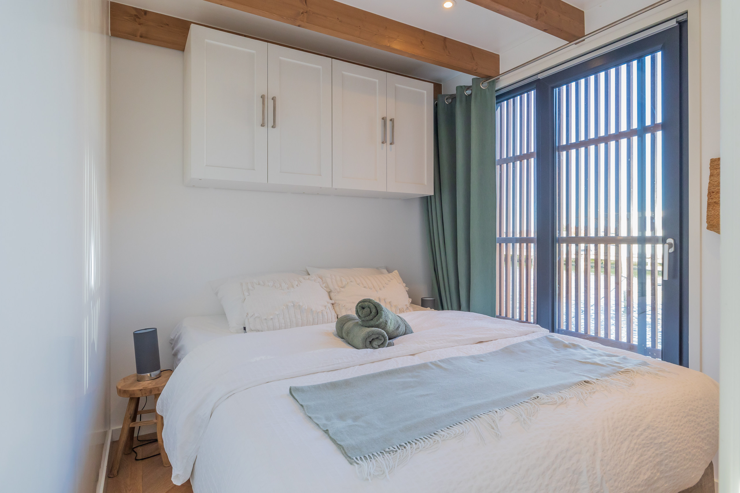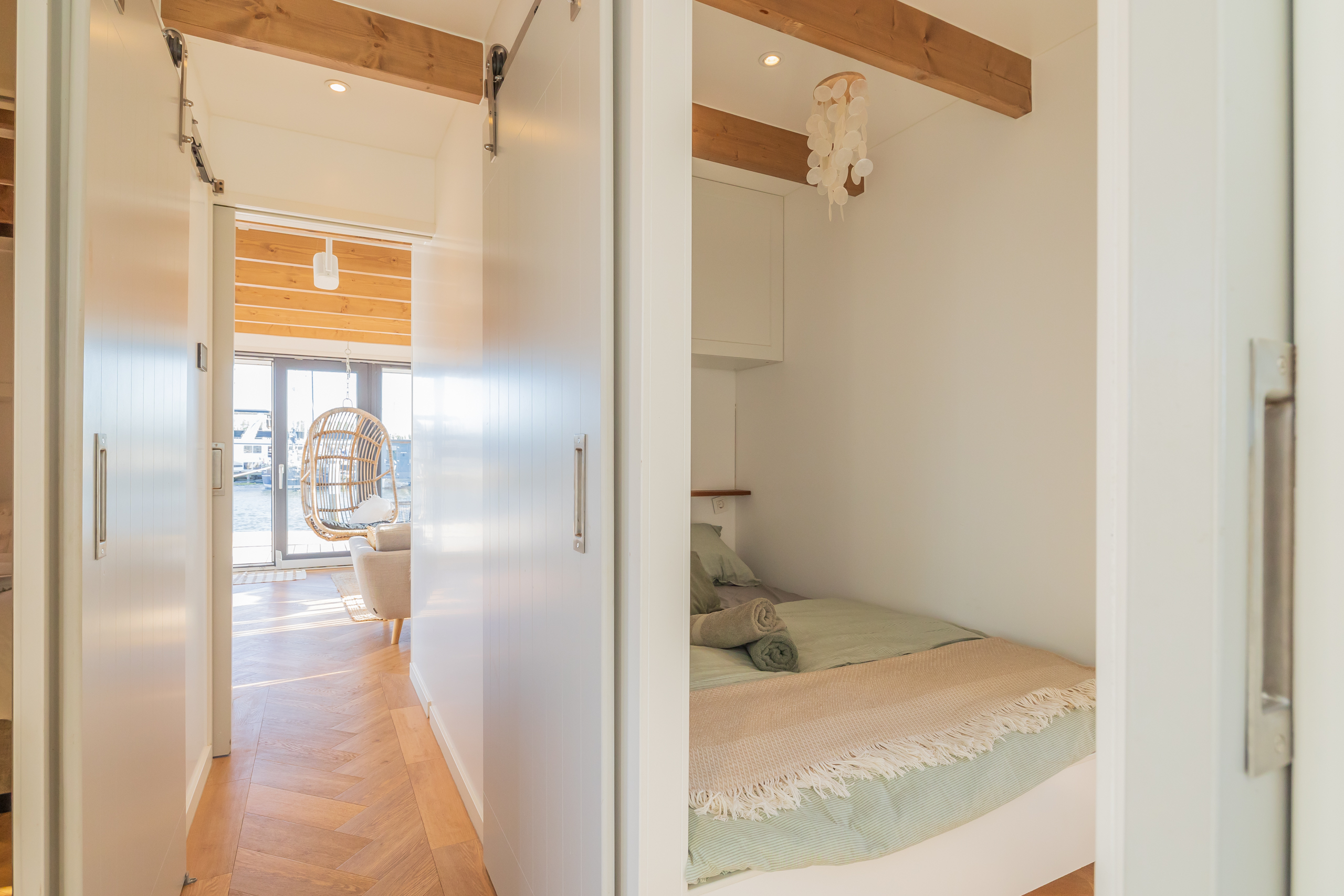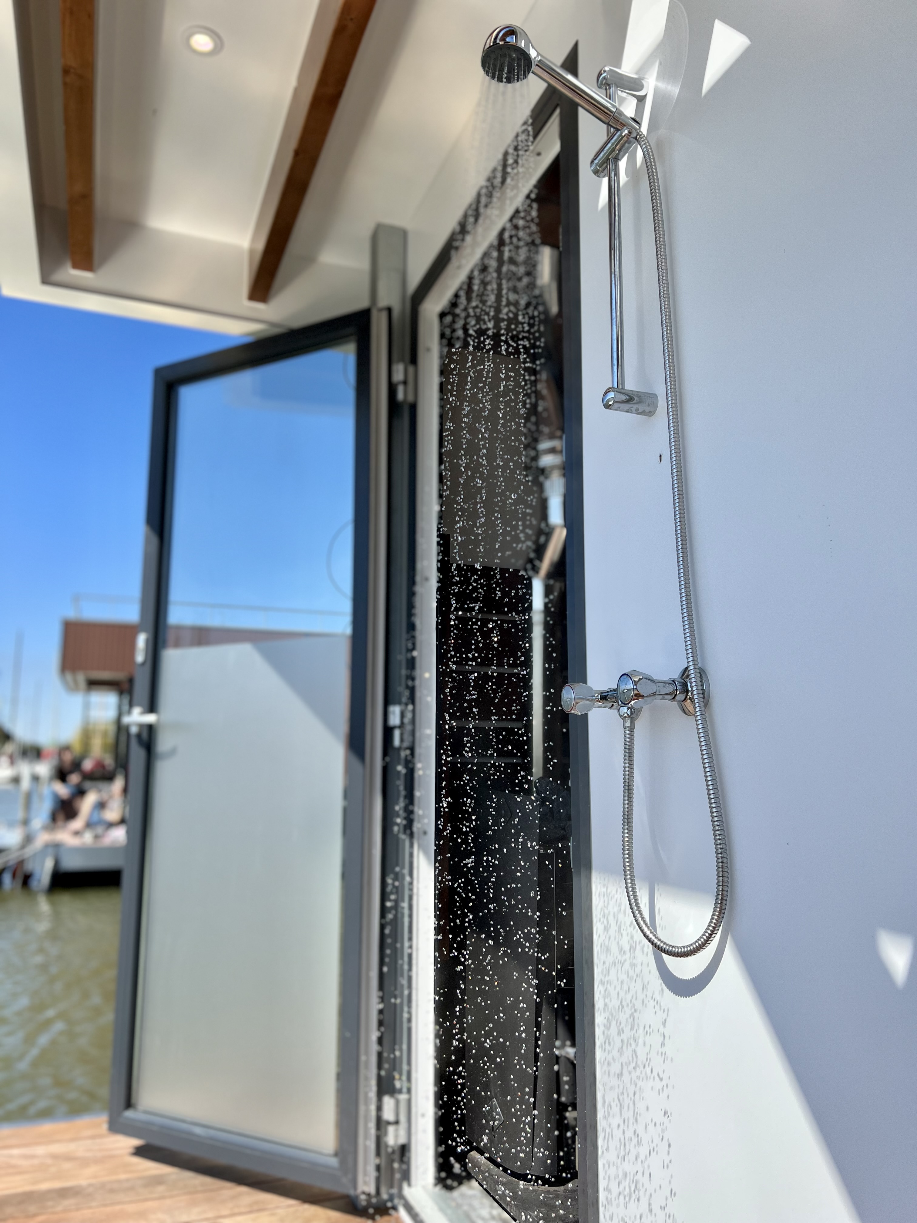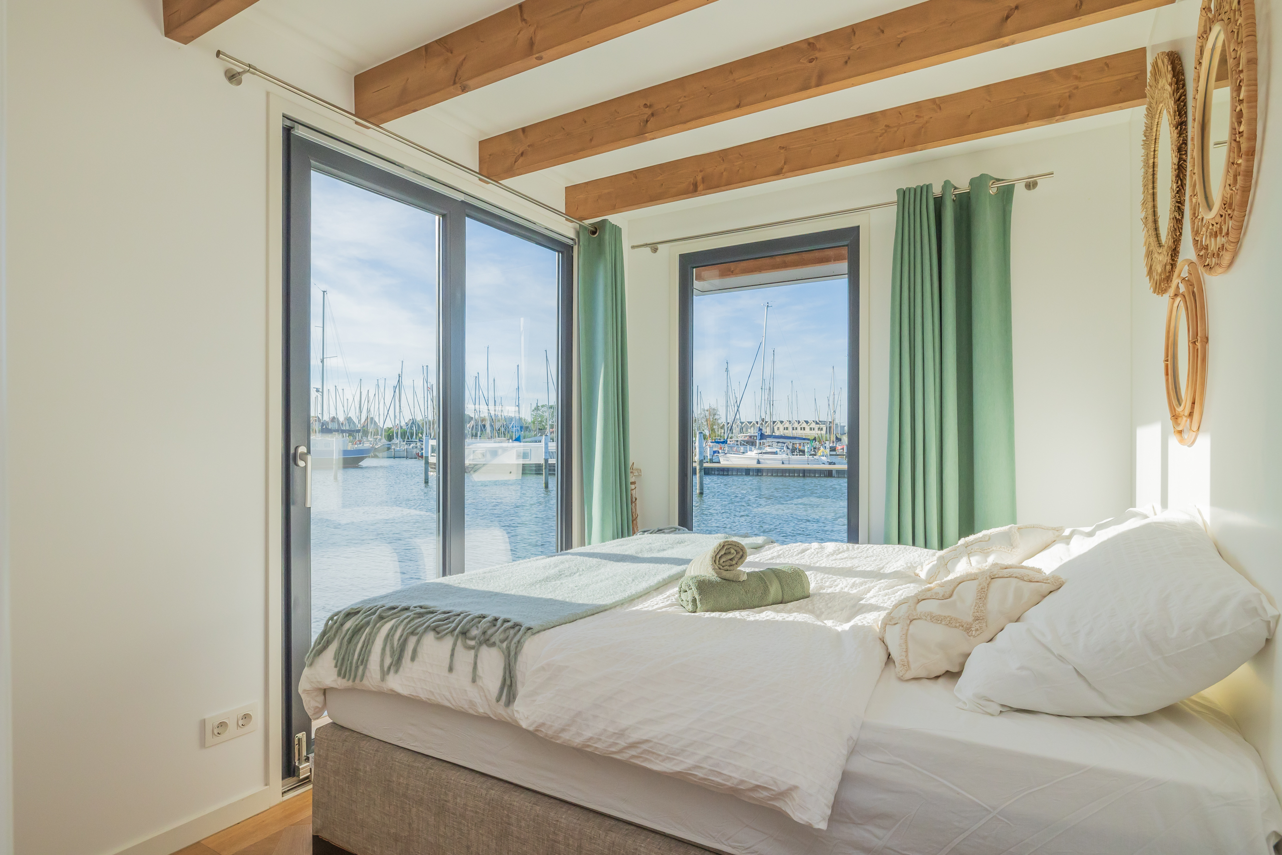 A Surla Houseboat is a sailing summer residence. Our water villas are fully equipped, This houseboat, our LUXURY version, is a special one from the Surla fleet. Built in 2023 with a SAUNA. Decorated in Ibiza style and fully equipped. There is a spacious living room with a couch, dining table, tv, Sonos sound system and sliding doors to the front terrace with outdoor chairs. The open plan kitchen is fully equipped with an induction cooker, fridge, oven, dishwasher, kettle and Nespresso coffee machine. There's also a table-top freezer in the utility room. The bathroom is equipped with a shower, sink and a (dry) toilet. There are 3 bedrooms on the houseboat. Two bedrooms with hotel beds (1.80 x 2.00m and 1.60 x 2.00m), especially designed for Surla Houseboats. The third bedroom has a cosy (1.40 x 2.00m) bed. Via outside stairs you can go to the spacious rooftop terrace where there is a lounge set to enjoy beautiful sunrises and sunsets. On the back terrace is a warm outdoor shower, great after a swim. And last but not least, the sauna! Host: Surla has check-in host, here name is Natasja. She will welcome you and guide you to the houseboat. It is nice for our hosts that you indicate early what your expected arrival time is. You will receive the host's telephone number in the instructions. You will receive this via email more than a week before arrival. Location: You can park your car in the marina of Monnickendam (free parking). After passing the entrance gate. Drive straight, after the white building, the 2nd road to the left. At the end of the road you can park your car. Location houseboat: In the summer (wheather permitting), Surla puts the houseboat in a beautiful spot/location on the lake. The houseboat remains in place by means of spud poles. In bad weather conditions, a Surla employee will put the houseboat in a sheltered place in the marina of Monnickendam. This can also happen during your rental period, because we don't want to take any risks. Surla Tender (Dinghy): During your stay we provide an dinghy. This aluminum tender is included during the rental of the houseboat. It is important that you start the tender with the trottle in Neutral. Do you want to lock the tender when you are not using it? Also at night? Sail slowly! Place the tender at the front or back of the houseboat. Gently moor so that there is no damage to the houseboat or tender. We will charge for damage immediately. The tender is fully fueled upon your arrival. The request is to put the amount on the table in cash: 40 euros for an empty tank and 20 euros for half a tank. If the tender has not been refueled and no money has been left behind on departure, we will charge the costs afterwards. Note: * We don't let our guests sail with the Surla houseboat themselves, but a dinghy is included in the rent. Sail at walking pace with the dinghy, we are guests on the water. Any fines are for your own account. Note: * We don't let our guests sail with the Surla houseboat themselves, but a dinghy is included in the rent. Sail at walking pace with the dinghy, we are guests on the water. Any fines are for your own account. * No parties or filming allowed. * We have a camera that faces outward, and it hangs outside on the front deck. This turns off as soon as the guests come on board. So it is purely for safety if there are no guests. There are no cameras inside. * Surla rents out several houseboats at different locations. It is possible that the location, the floorplan of the houseboat and the interior in the photos differs from the actual houseboat. All our houseboats were built in 2022-2023. * Swimming certificates are highly recommended. We will not recommend the houseboat for people with walking difficulties. * We advise you to do necessary shopping before boarding. Standard on board is a few Nespresso coffee capsules, milk, sugar, tea, oil, pepper, salt and a few toilet rolls. We have towels and the beds are made for your arrival. Sauna: This houseboat has a wood sauna on board, which is located at the back of the houseboat. Surla provides wood, firelighters and kindling wood. It is the tenant's responsibility to use the sauna in a proper manner. Please understand that you work with open fire, do not use any other flammable substances than provided by Surla (firelighters, kindling and firewood). The use of the sauna is entirely at your own risk. Our Surla Houseboats are built sustainably and are 100% self-sufficient.We have ingenious systems on board that allow you to recreate without going on shore power, and we also have filter systems that mean we don't have to have water tanks on board.We are guests on the water and have done everything possible to implement 100% off-grid and ecologically responsible solutions. We would love to welcome you as guests to create beautiful memories with this unique experience.